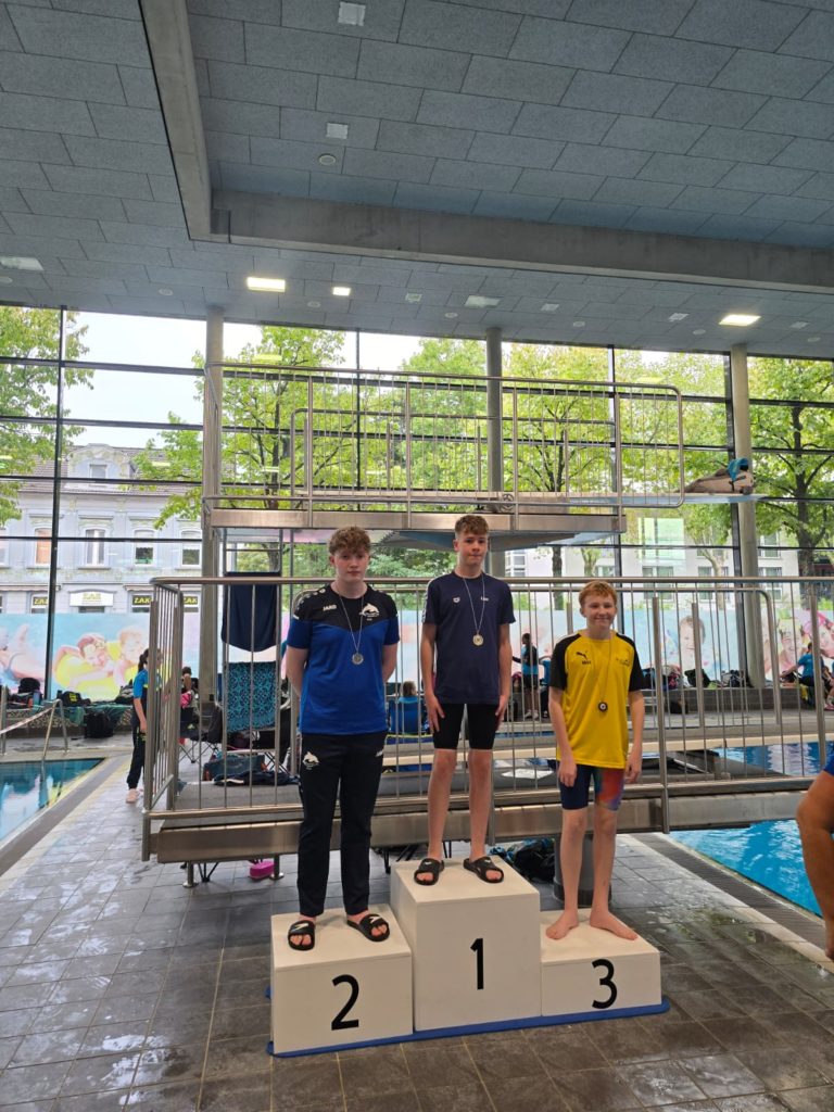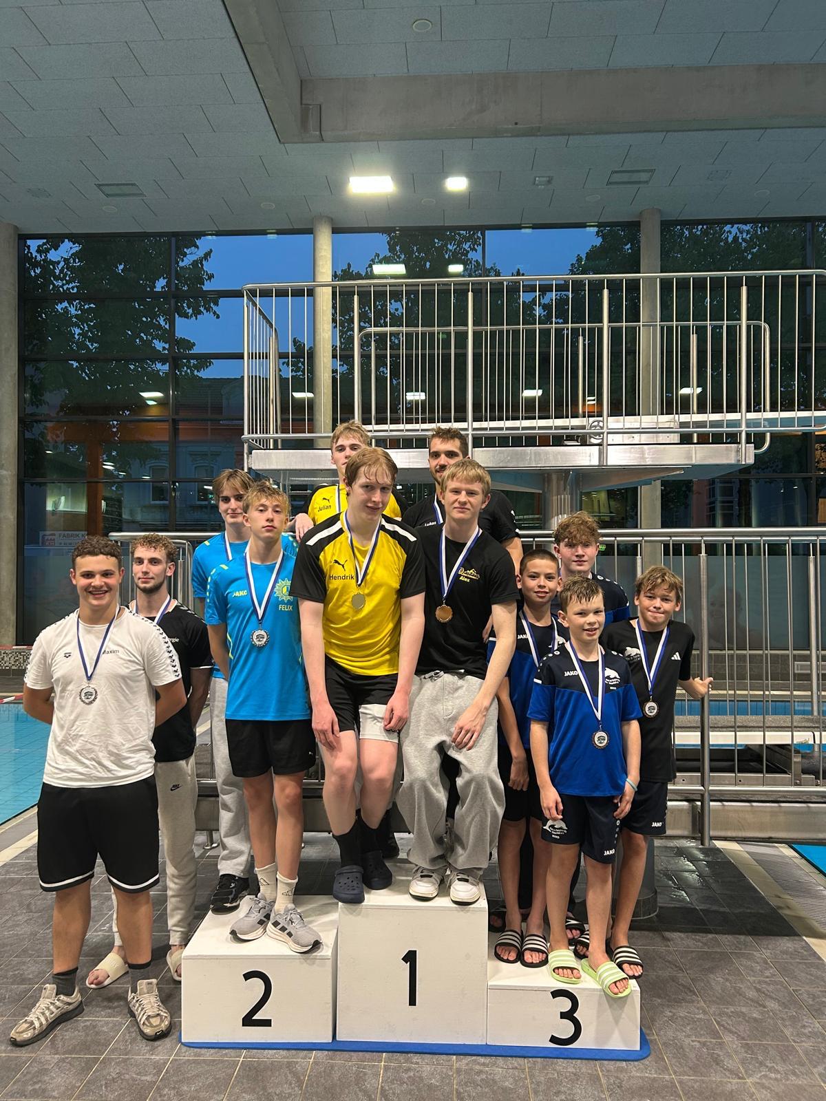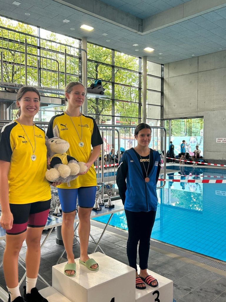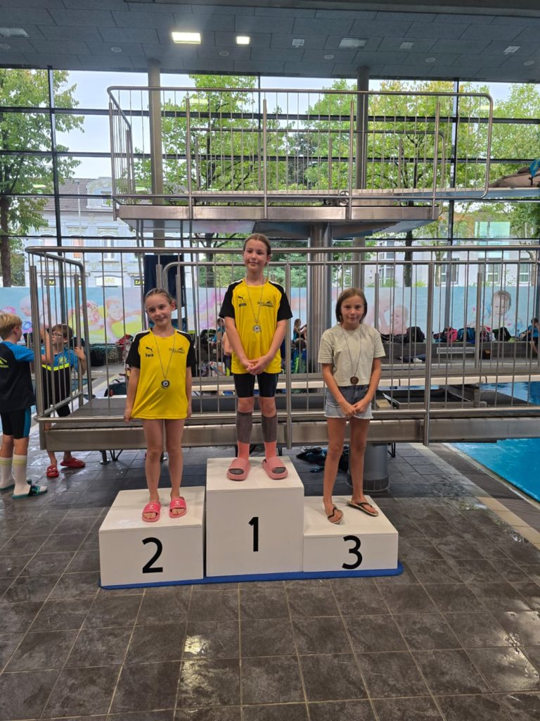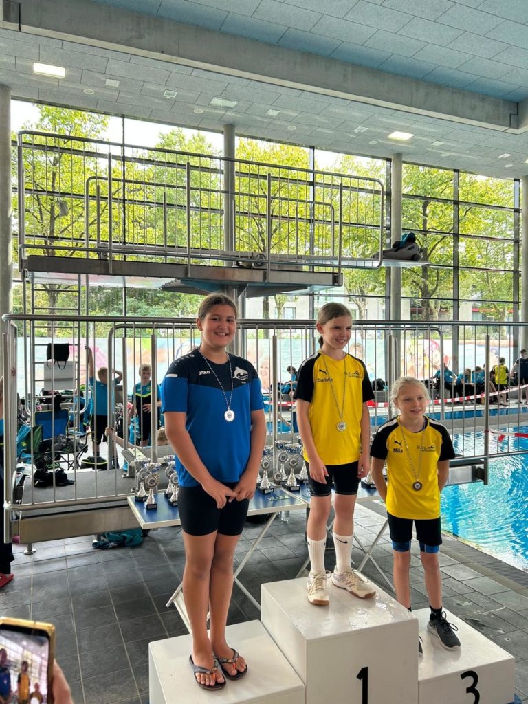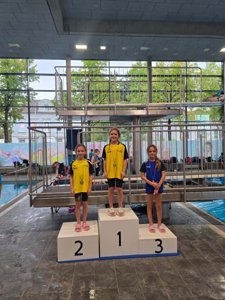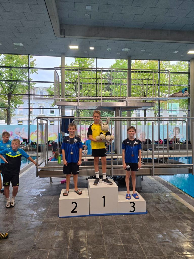 Erstmals an den Start durften bei diesen Stadtmeisterschaften über die kurzen Strecken die Aktiven des Jahrgangs 2017, die sich aufgeregt, aber zuversichtlich in die Fluten stürzten, um auf Medaillenjagd zu gehen. Wie routiniert die Delphine Sofia Kostarev, Bjarne Kuhlmann und Lena Krüger dennoch schon sind, zeigen ihre strahlenden Gewinner*innen-Gesichter: