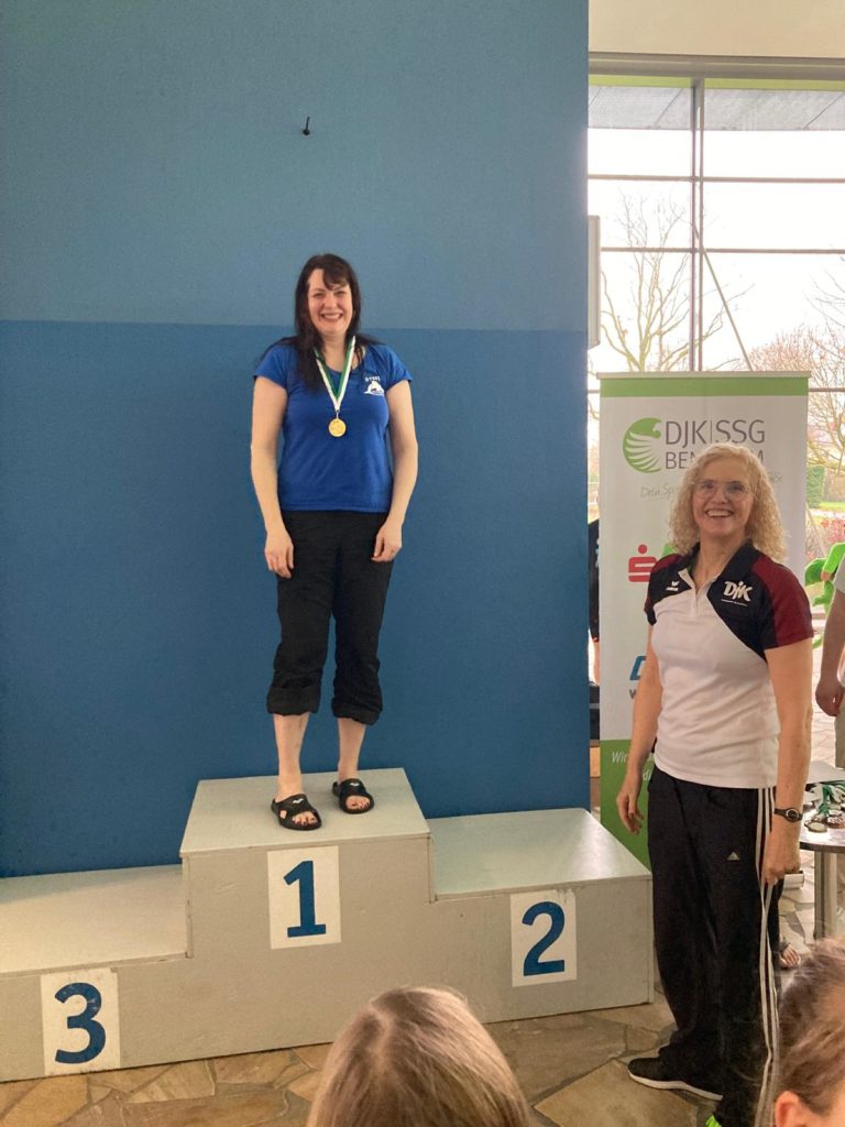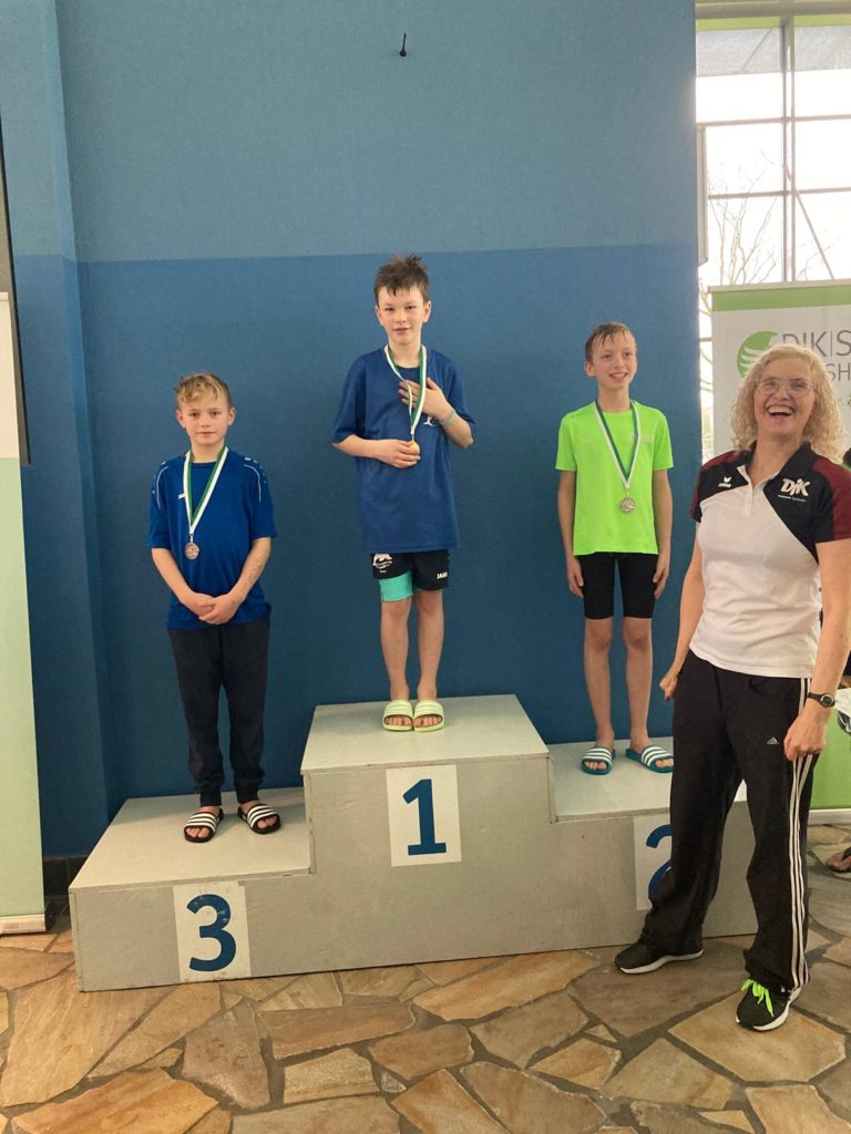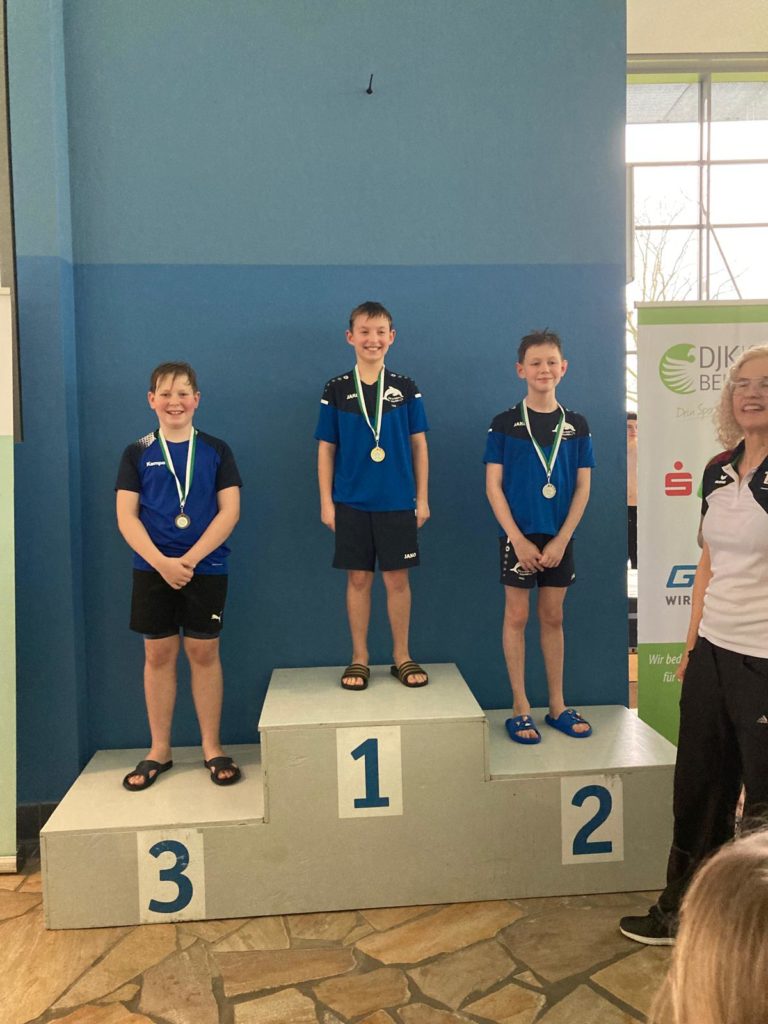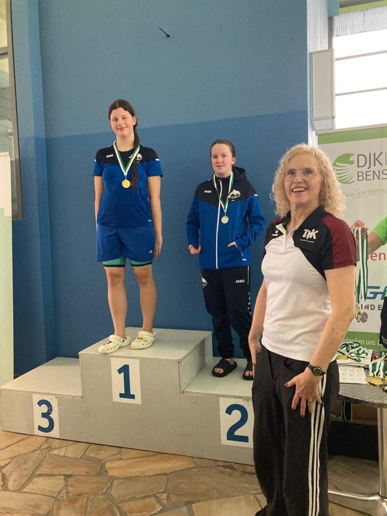 Auch die Masters, „Old-Stars“ und Jung-Trainer*innen mischten sich unter die Aktiven: Stefanie Bielitzki (1976), Frank Koböck (1977), Felix Uhle (1999), Josephine Belting (1999), Katrin Bürger (1998), Fynn Schlebusch (2003) und Julian Geßner (2001) begleiteten den Wettkampftag am Beckenrand und im Wasser, während Stephanie Hendrichs und Simone Garus die „Land-Crew“ bildeten.