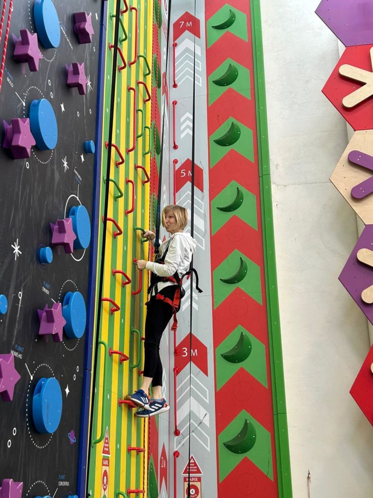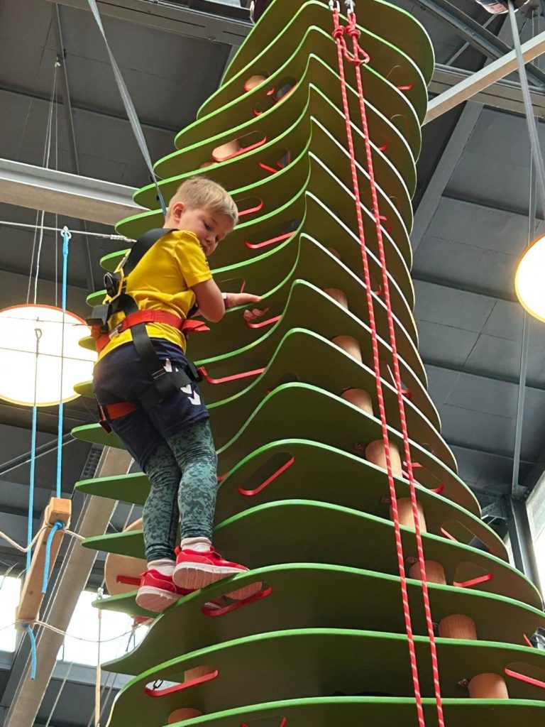 Statt also im Schwimmbad Kacheln zu zählen, trafen sich die Delphine also pünktlich um 9 Uhr bei Hapik in Mülheim. Dort ging es nicht um Bahnen, Wenden und Startsprünge, sondern Griffe, Tritte und Kletterrouten sowie darum, gleich zwei anspruchsvolle Parcours in einigen Metern Höhe zu überwinden. Dabei mussten die Trainer*innen schnell feststellen: Im Schwimmbad haben sie zwar die Hosen an, doch an der Kletterwand machen ihnen die jungen Aktiven ordentlich Konkurrenz. In weniger als 20 Sekunden flogen die Jungdelphine delphingleich die Kletterwände hoch, während ihre Trainer*innen gerade einmal zwei Meter über dem Boden an der Wand hingen und merkten, dass ihnen der gewohnte Auftrieb des Wassers doch mehr fehlte als gedacht. Beine und Unterarme brannten, doch Teamgeist und Spaß erwiesen sich als absolut wasserfest – und offenbar auch höhentauglich!